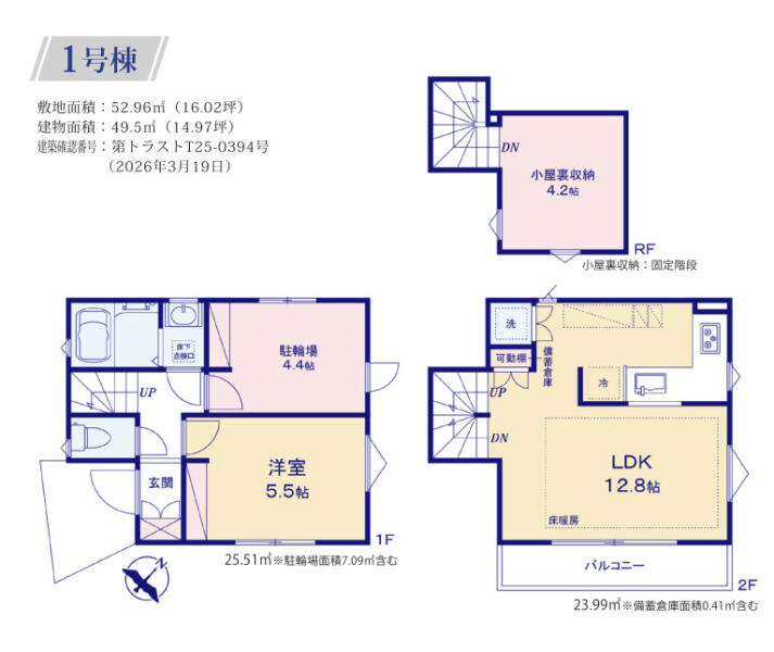 | 建築延床面積 | 42m² | 土地面積 | 52.96m² |
